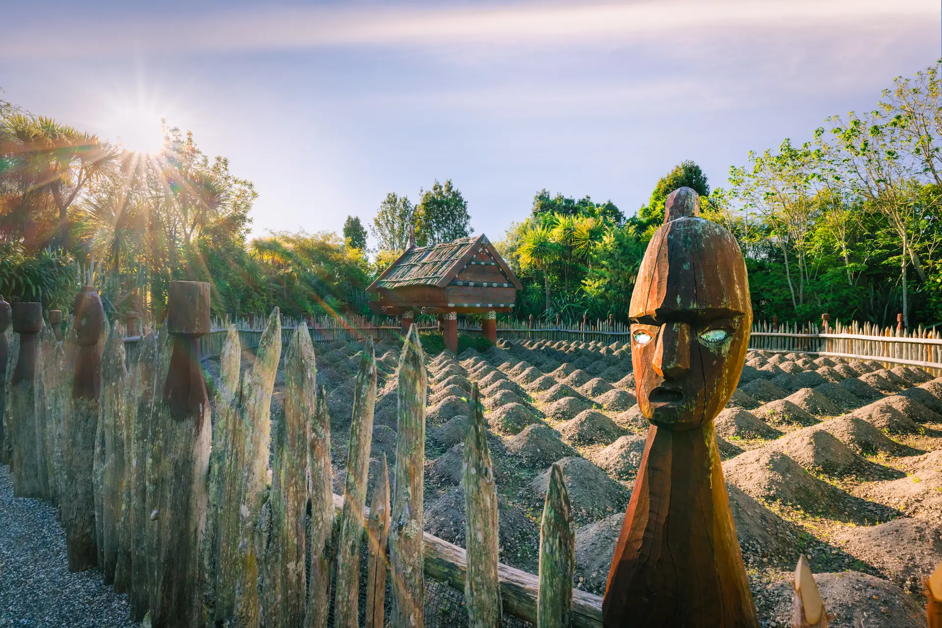 Long before Hamilton Gardens existed, this land was home to Ngaati Wairere. Around 700 years ago, their paa sites lined the Waikato River, and the fertile soils made this area a horticultural hub. The first gardeners here grew kuumara, taro, and other crops brought on the Tainui waka (canoe) from Polynesia. Growing kuumara in this cooler climate required incredible skill – planting in mounds to capture warmth, following the Maramataka calendar, and using techniques passed down through generations. That ingenuity and connection to the land is something we’ve sought to honour in every design decision.